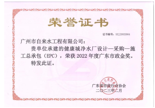 健康城净水厂设计-采购-施工总承包(EPC)工程荣获广东市政金奖